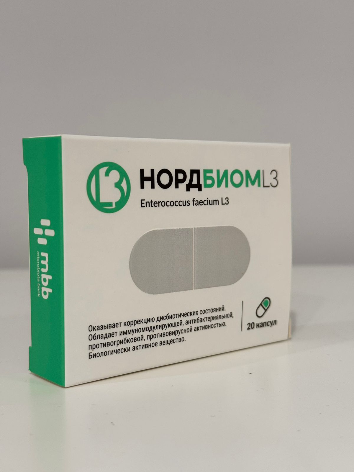 БАВ Нордбиом L3 содержит биомассу пробиотического штамма молочнокислых бактерий Enterococcus faecium L3 в количестве не менее 1*10^9 КОЕ/г.